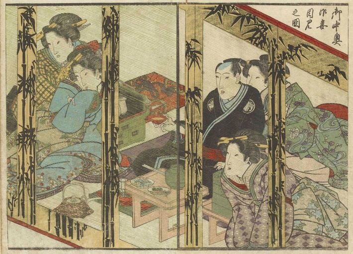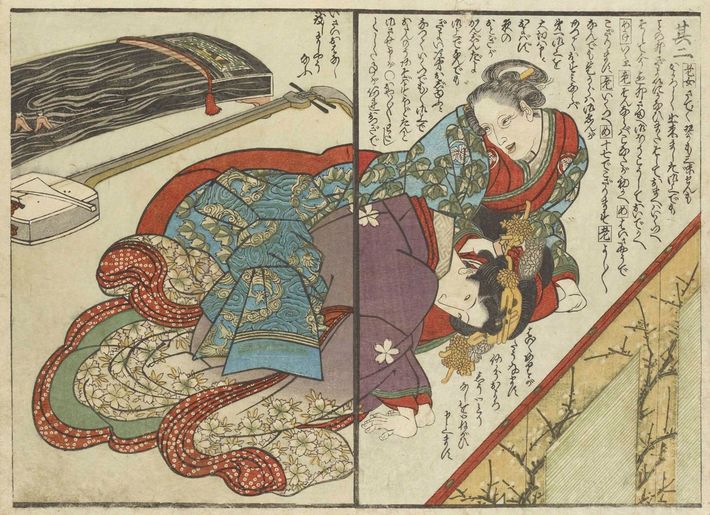 図版2:裕福な商人と妾[渓斎英泉画『狂歌恋の道草』(部分)、1825年(文政8)ごろ、国際日本文化研究センター蔵]