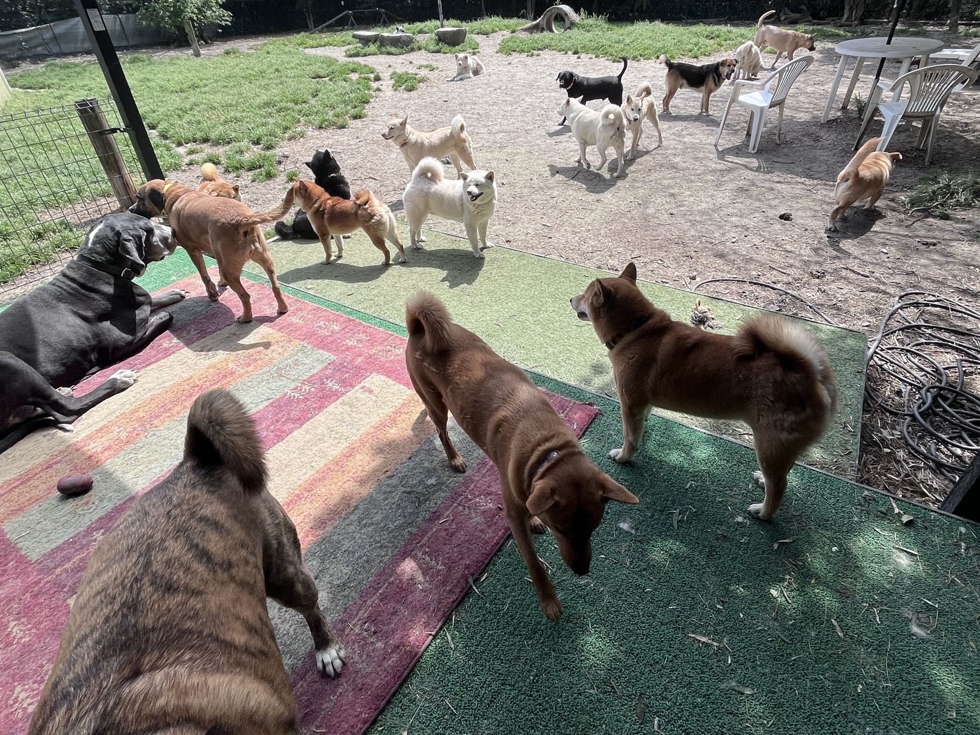 取材当日はあいにくの小雨模様。奥の白い犬だけは樹木の下でずっと雨宿りしていた
