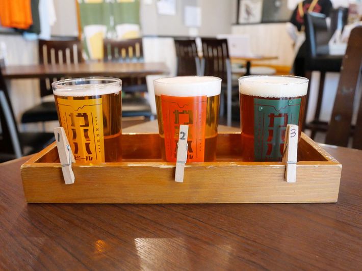 3種飲み比べセット。左から①スッキリ系の「馬場のブロンド」②ほどよい苦味系の「マーシーIPA」③モルティ系の「ダンチエール」をチョイス