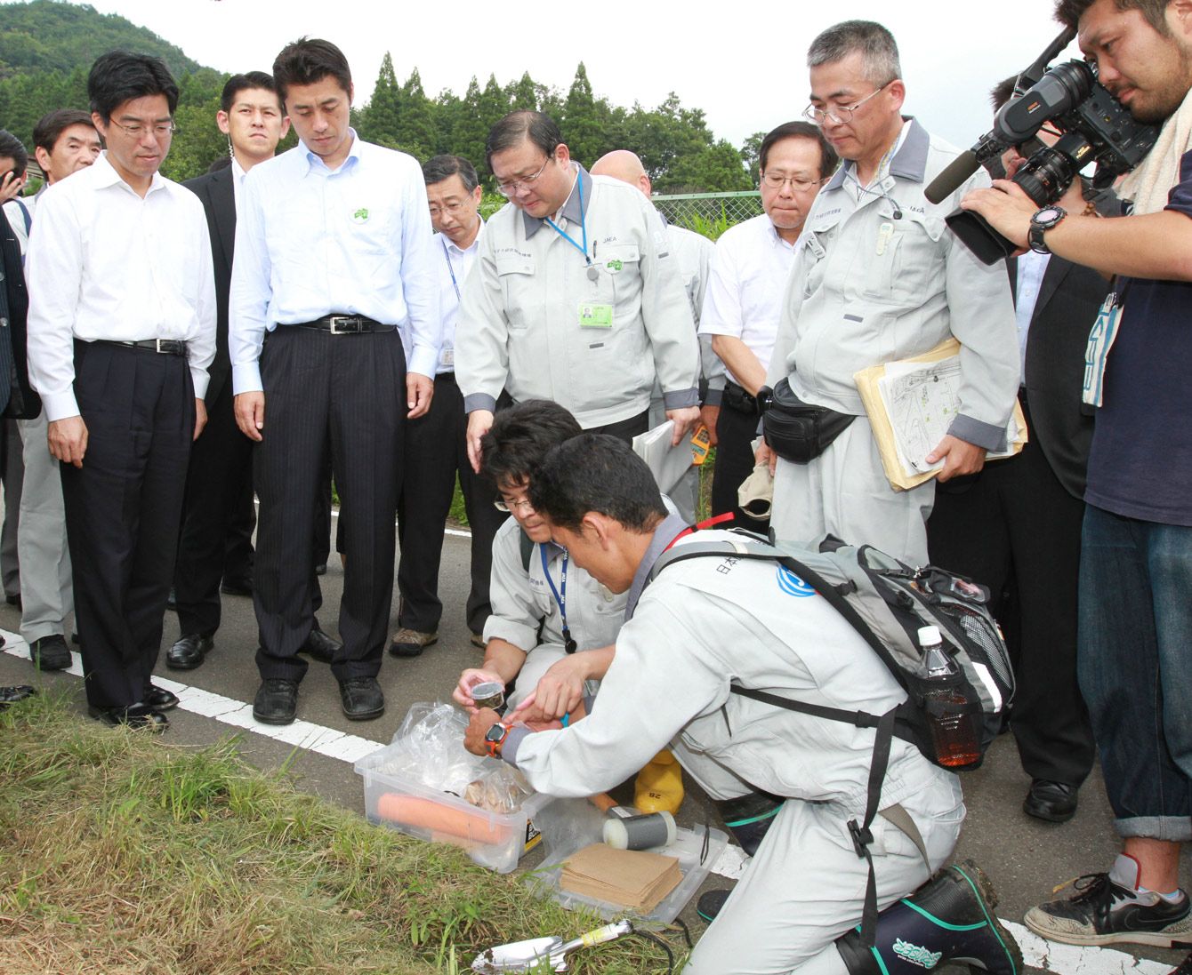 2011年8月24日、福島県伊達市で国の除染モデル事業を視察する細野豪志原発事故担当相(当時=左から2人目)。当初、除染に積極的だった伊達市だが、その後、除染に消極的と方針転換した。
