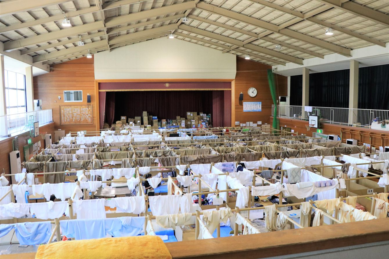 2018年の西日本豪雨の際、岡山県倉敷市にできた避難所の様子。発災から1カ月程度がたち、多少環境は整ってきた時期だが、避難所生活には制限も多い