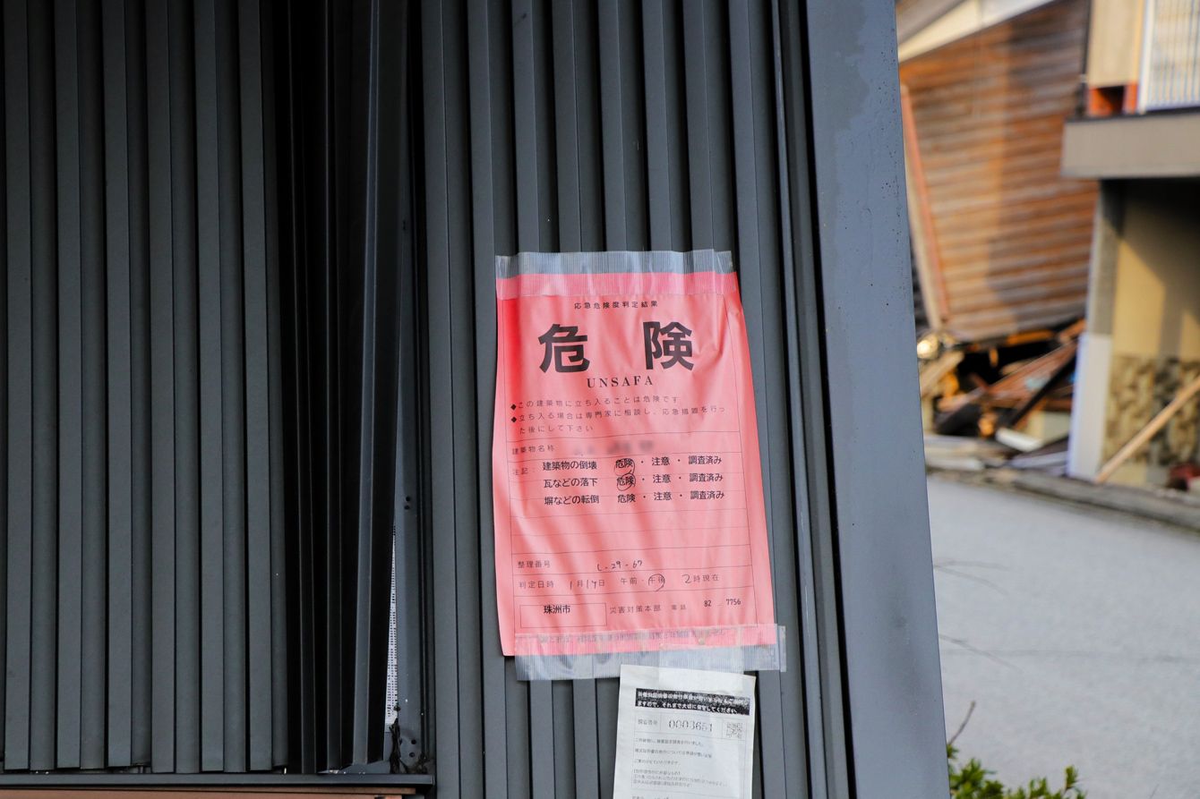 応急危険度判定によって「危険」とされた家屋。在宅避難はできず、家屋から物資を取り出すのも難しい。2024年3月、石川県珠洲市で