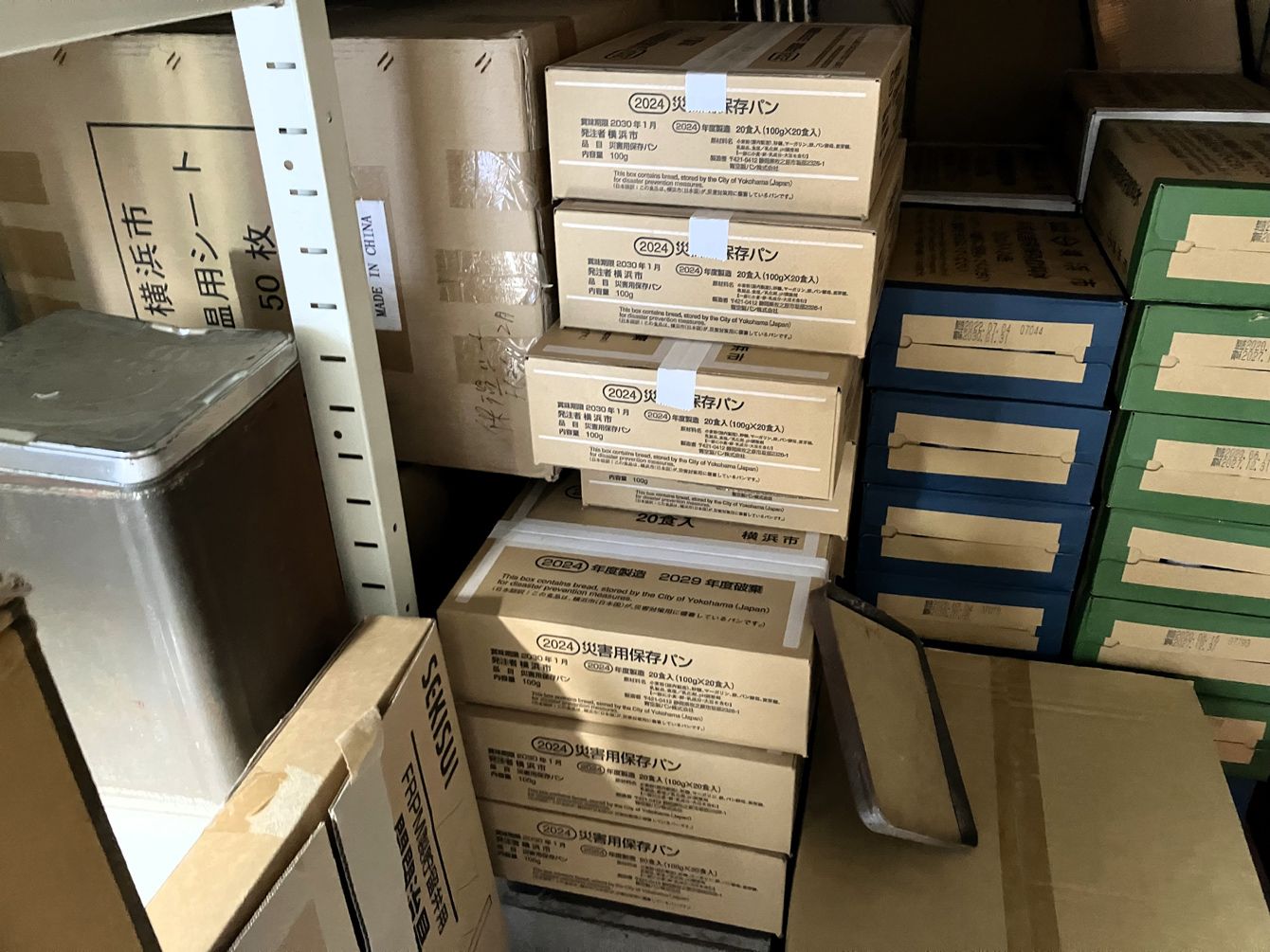 防災備蓄倉庫に積まれた食料の一例。自治体にもよるが、簡易的なものが中心で量も十分でないケースが多い