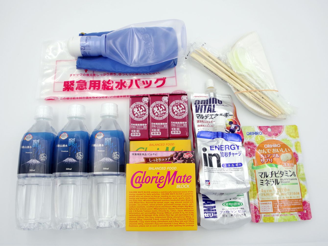 高荷さんが非常持ち出しセットに入れている水と食料。飲料水のほか、保存用のようかん、ゼリー飲料、エナジーバー、栄養補給用のサプリを含めている。避難所で食べることを想定し、常温以下で食べやすくてにおいを発しないものを選んでいる