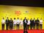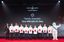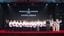 壇上にずらりと並んだ受賞店のシェフたち。壇上に上がる前に胸元に受賞した星の数が刺繍されたスペシャルコックコートが渡され、それに袖を通してから盾を受け取るのが習いだ。