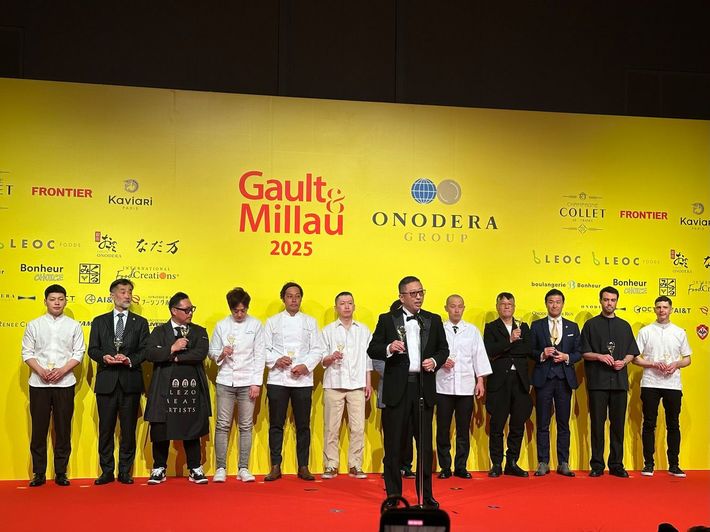 『ゴ・エ・ミヨ』2025年のアワードセレモニーの様子。順位を競い合うというよりは、多彩に設けられた賞をもって若手シェフから生産者に至るまでを祝福する雰囲気が特徴。日本におけるファインダイニングのガイドブックとしては唯一、47都道府県を網羅している。