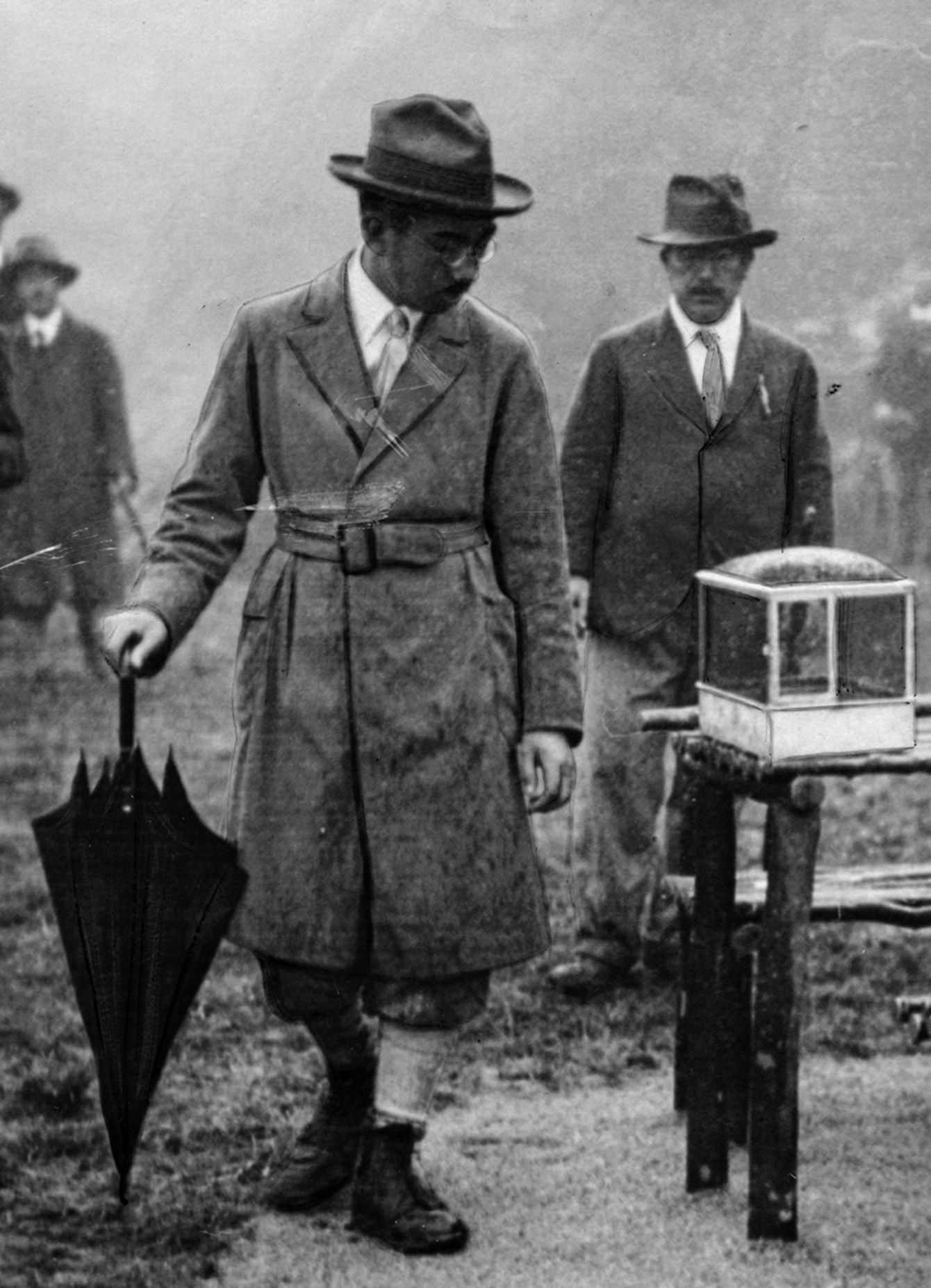 悪天候のなか天城山に登り、山上の八丁池畔でモリアオガエルを観察する昭和天皇=1930年[出典=『