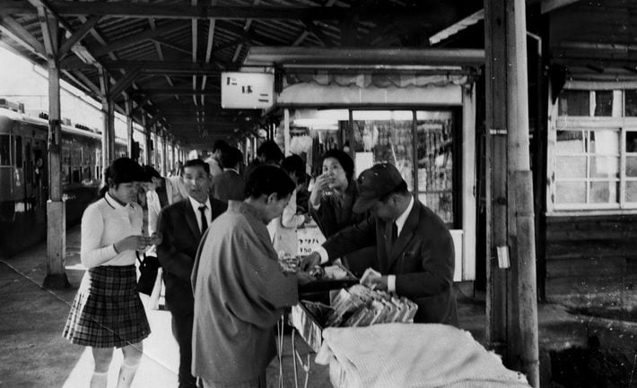 信越本線横川駅の駅弁売り。「峠の釜めし」は同駅の名物駅弁だ=1970年撮影[出典=『
