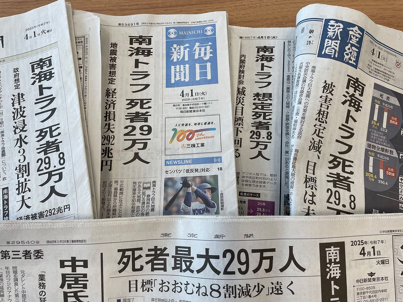 「死者29.8万人」の見出しが躍る新聞各紙の4月1日付朝刊1面