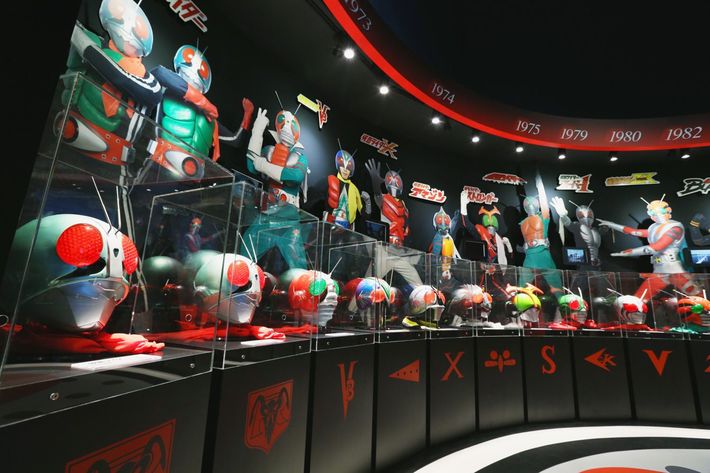 東日本大震災の津波で被災し、集まった寄付金で展示物の改装を行った漫画家・故石ノ森章太郎さんの作品を紹介した「石ノ森萬画館」。1971年の「仮面ライダー1号」から歴代のマスクがずらりと並べられた展示(=2013年3月19日午後、宮城県石巻市)