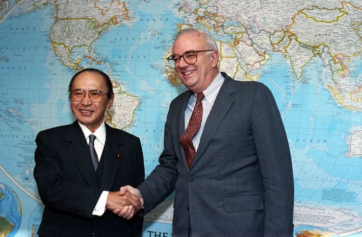 1993年2月12日、ペンタゴンにて、当時の渡辺美智雄副総理兼外務大臣と記念撮影するレスリー・アスピン・ジュニア米国国防長官(写真=ROBERT D. WARD, CIV/PD US Military/