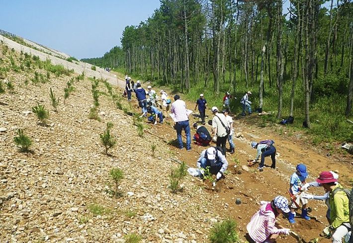 浜松沿岸の防潮堤を小学生らが植栽する様子