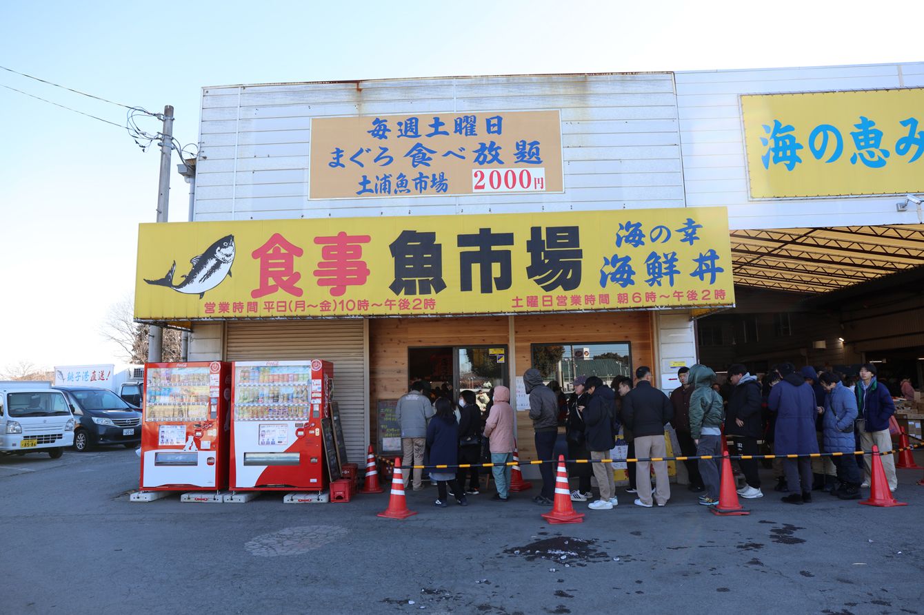 土浦魚市場食堂。2000円のマグロ食べ放題を目当てに、大勢の客が列を作っている