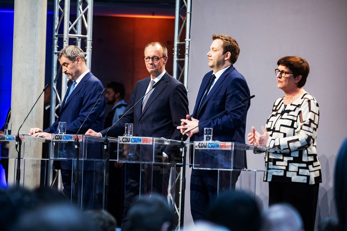 2025年4月9日、ドイツ・ベルリンで行われた連立交渉成功後の記者会見に臨むバイエルン州のマルクス・ゾーダー首相、CDU(キリスト教民主同盟)のフリードリヒ・メルツ党首、SPDのラース・クリングバイル党首とサスキア・エスケン党首。