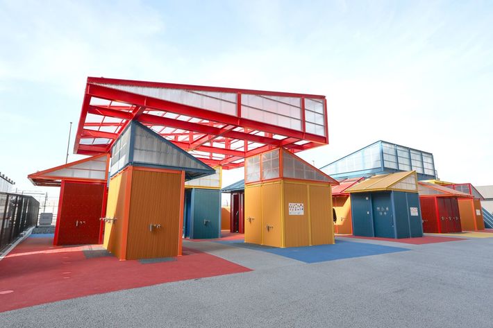 カラフルなユニットが積み木のように積み重ねられた会場のトイレ=2025年4月9日、大阪市此花区
