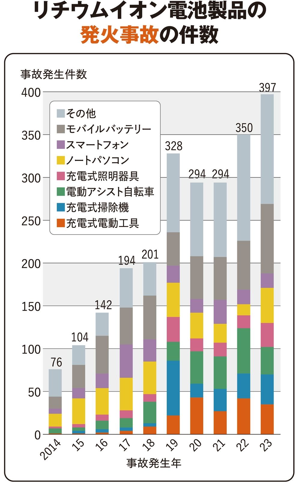 事故には、純正、非純正いずれも含まれる。2019年以降、充電式掃除機と充電式電動工具用の非純正バッテリーの発火が急増。モバイルバッテリーの事故も多い。(出所=NITE)