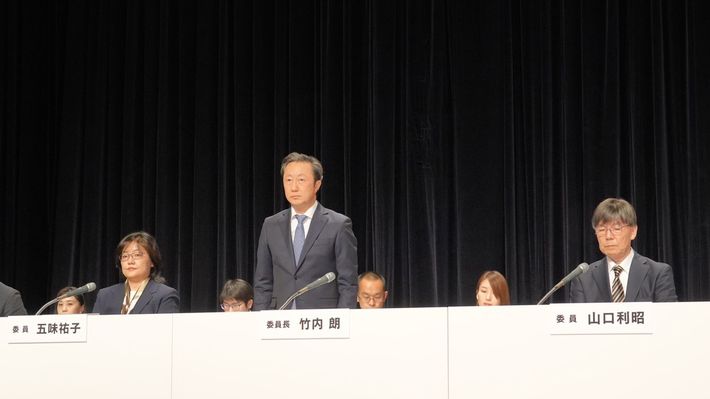 第三者委員会の報告会に登壇する委員長の竹内朗氏、委員の五味祐子氏、山口利昭氏