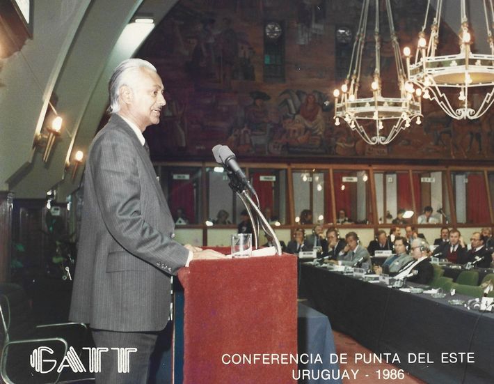 1986年9月16日、ガット・ウルグアイ・ラウンド交渉で発言するウィルフレッド・ナイモール(写真=Need4justyce/CC-BY-4.0/