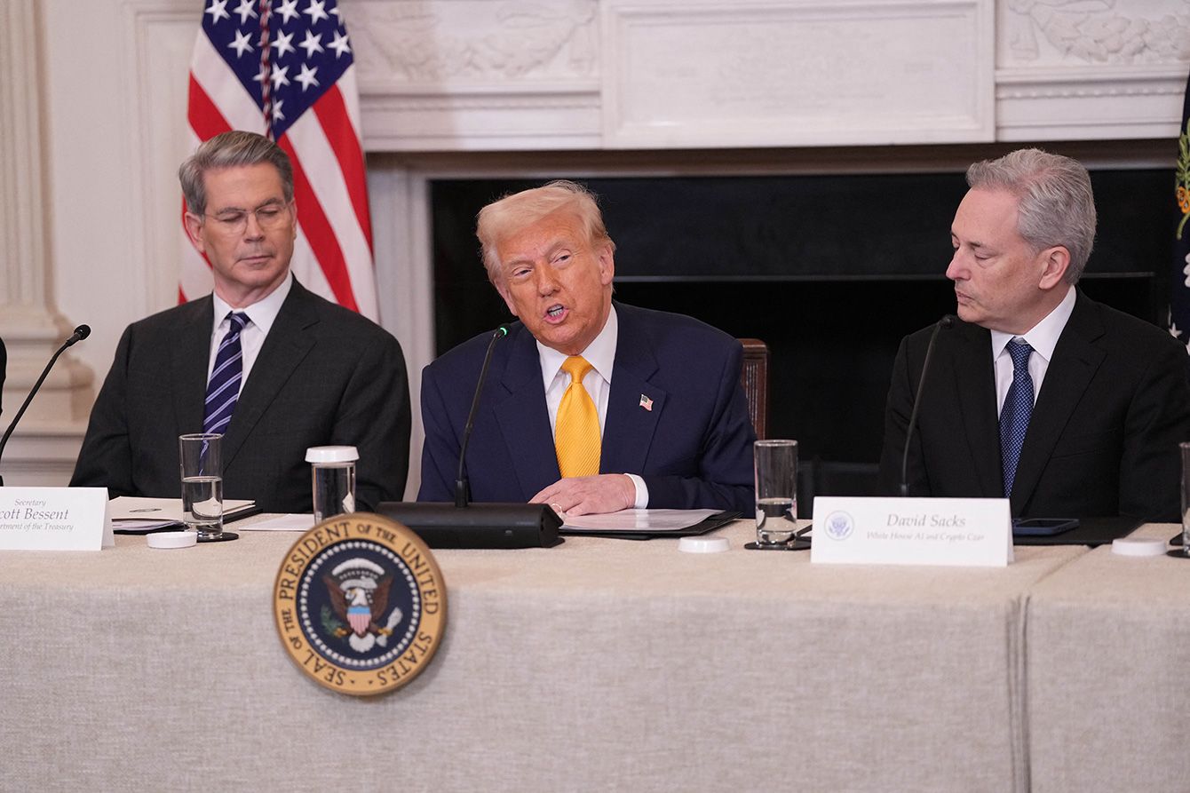 2025年3月7日、ホワイトハウスで開催された暗号資産サミットで発言するトランプ大統領。左はスコット・ベッセント財務長官、右はAI・暗号資産責任者デービッド・サックス氏