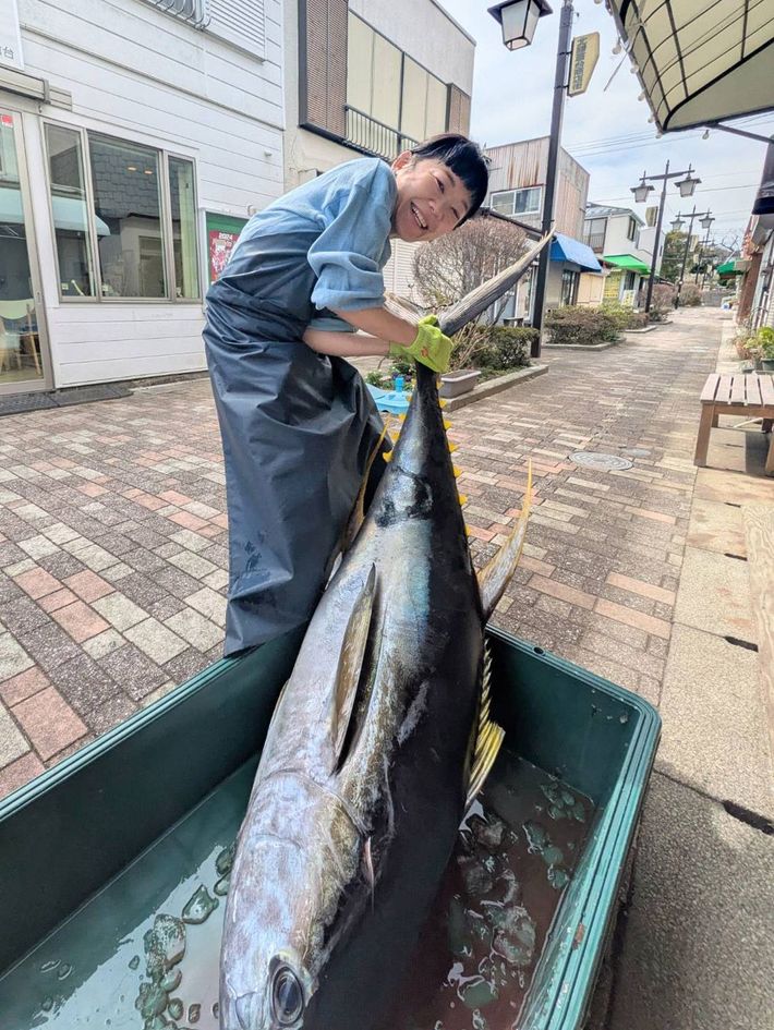 キハダマグロの巨大なカマ(エラの横にある胴体側の部位)を見せてくれる上田さん。「丁寧な仕事で魚のすべてを無駄なく活かす」がマルカマの基本方針の一つ