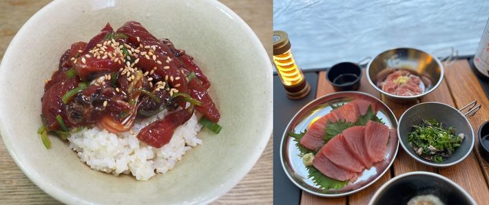 写真左=こんなに旨いならば全部ヅケでもいい、と思うほど満足感が高かった漬け丼。半分残してお茶漬けにした。写真右=キハダマグロを分けた仲間のソロキャンプの様子。「刺身はもちろん、ネギ皮ポン酢が日本酒に合い過ぎます!」と興奮気味に報告してくれた