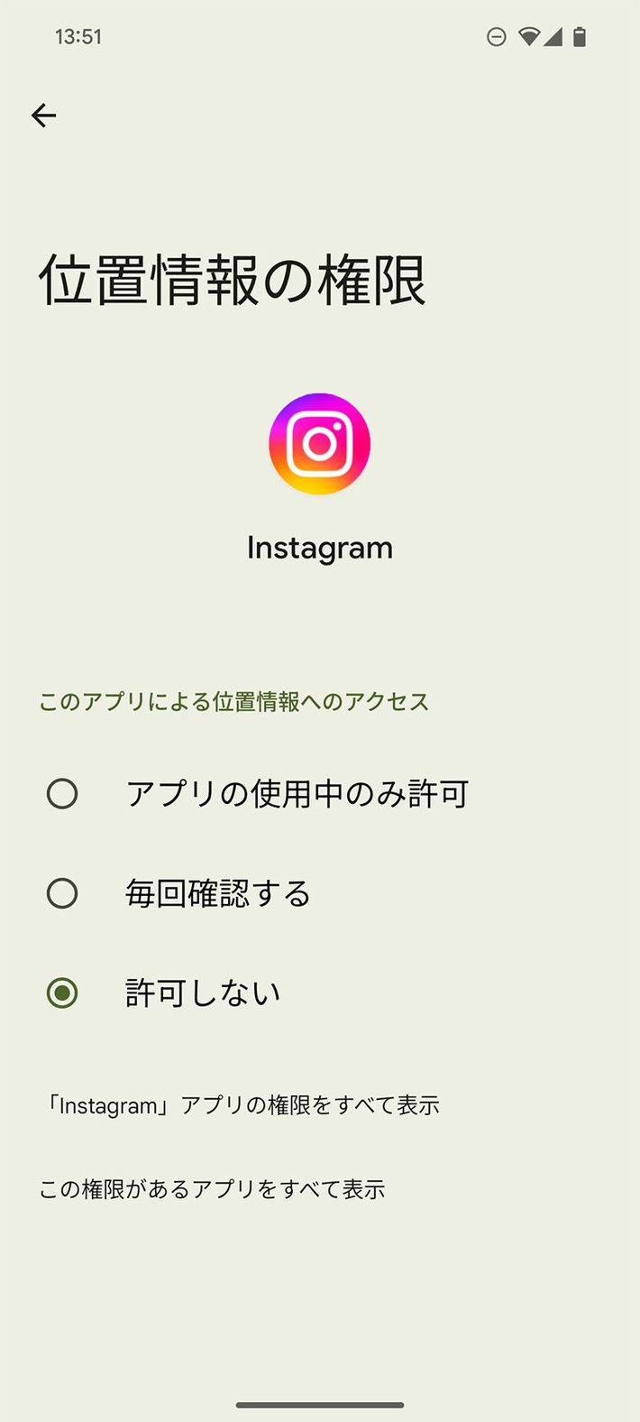 Androidでは、「アプリの権限」などで「Instagram」を選び、「許可しない」を選択する