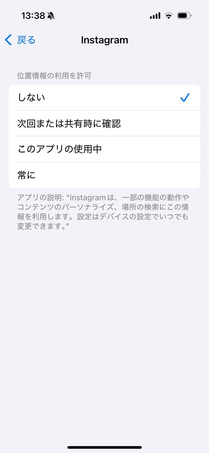 iOSでは、「位置情報サービス」で「Instagram」を選び、「しない」を選択する