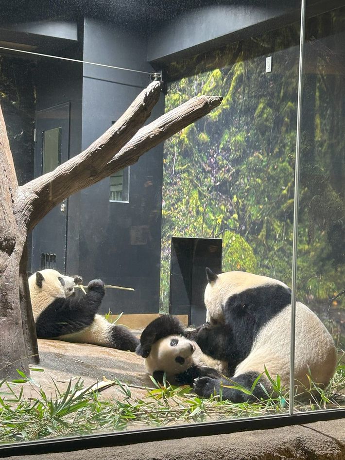 朝ごはんを頬張りながら母親とじゃれあうシャオシャオとレイレイ=2023年2月、上野動物園
