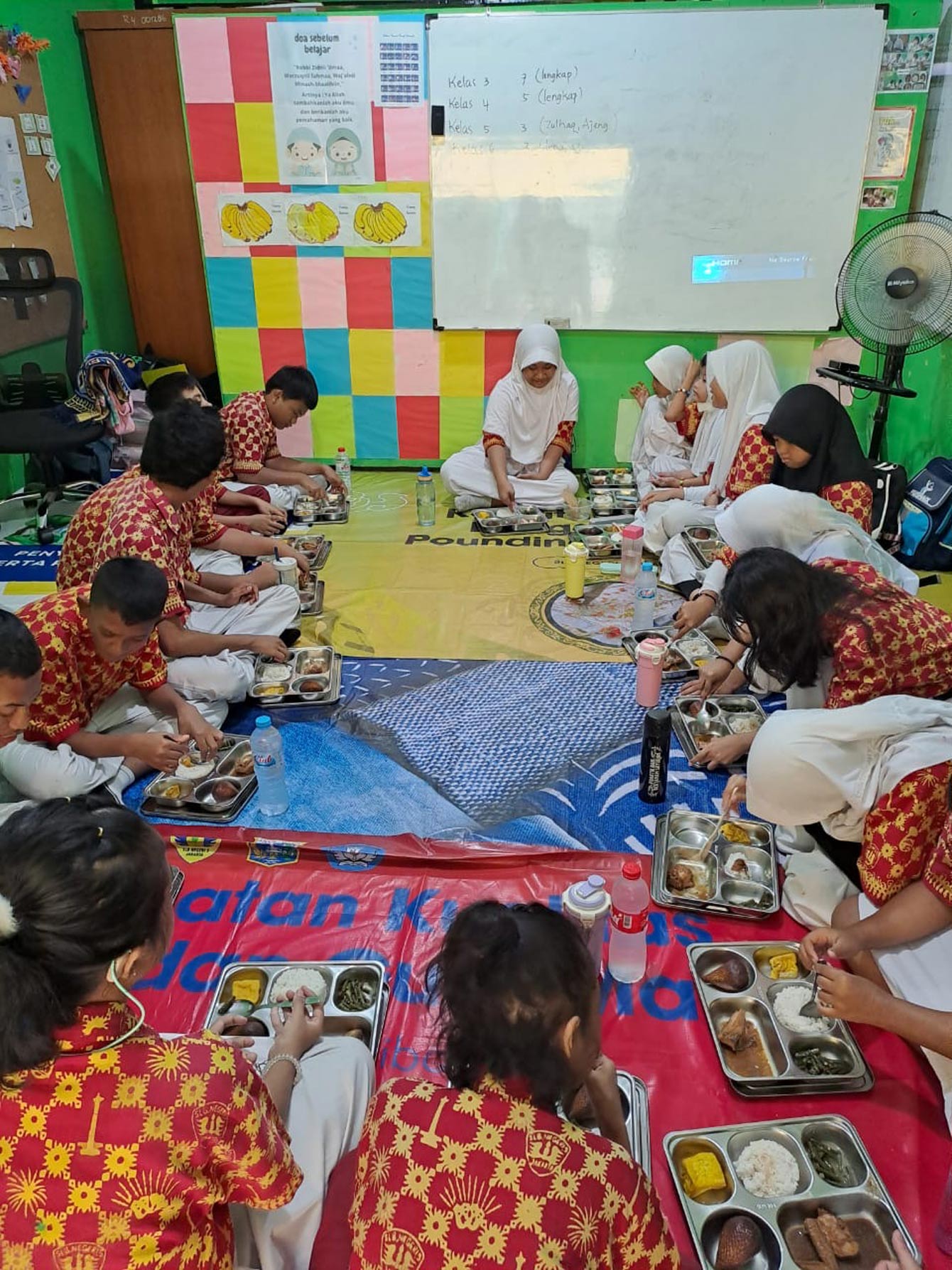 提供された給食はインドネシア国内全土の児童・生徒が口にするだけに安全性確保が課題だ=西ジャカルタの小学校で