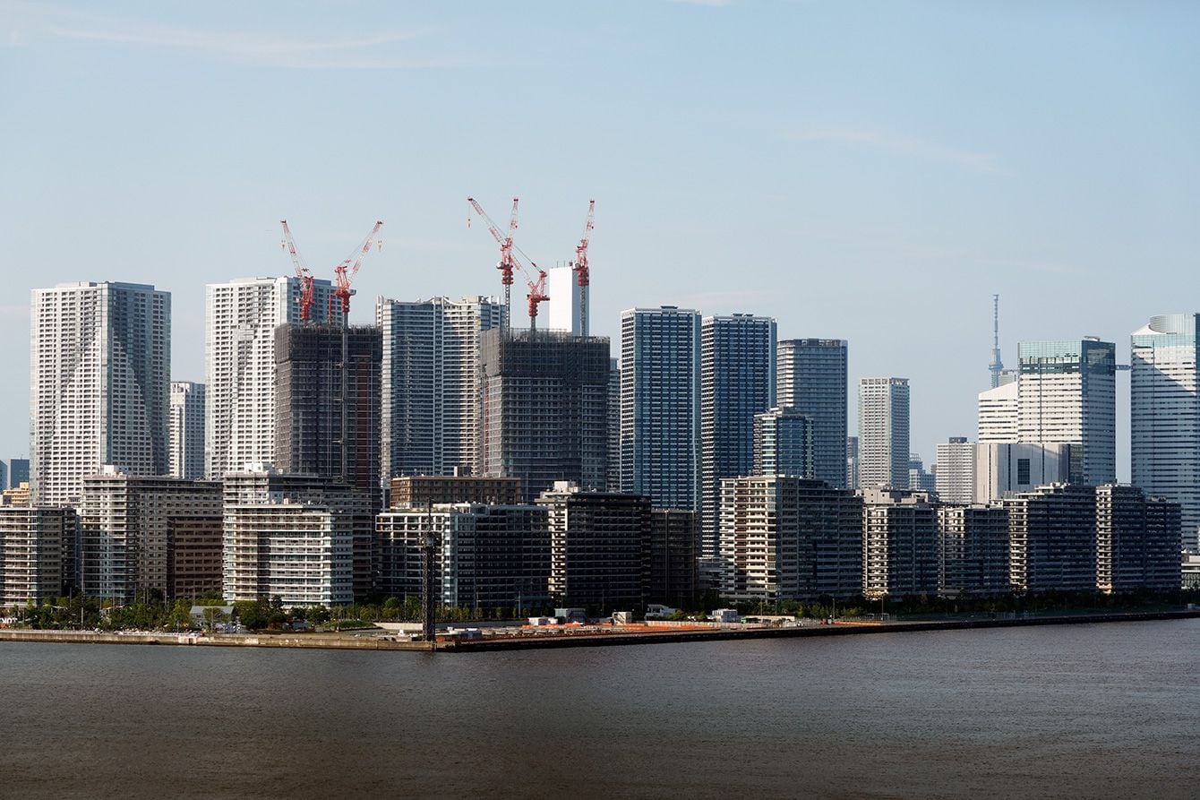 東京五輪・パラリンピック選手村として使用されたあと分譲された「晴海フラッグ」と林立する高層マンション(2024年6月1日、東京都中央区)