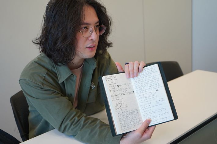 人工言語のアイデアが書かれたノートを手に取る中野さん