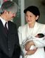 秋篠宮さま(左)に付き添われ、悠仁さまを抱いて東京都港区の愛育病院から退院される紀子さま。2006年9月15日撮影
