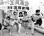 舞台「笑って踊って全員集合」のPRをするザ・ドリフターズのメンバー(左から)高木ブー、志村けん、加藤茶、仲本工事、いかりや長介=1975年4月18日、東京・赤坂