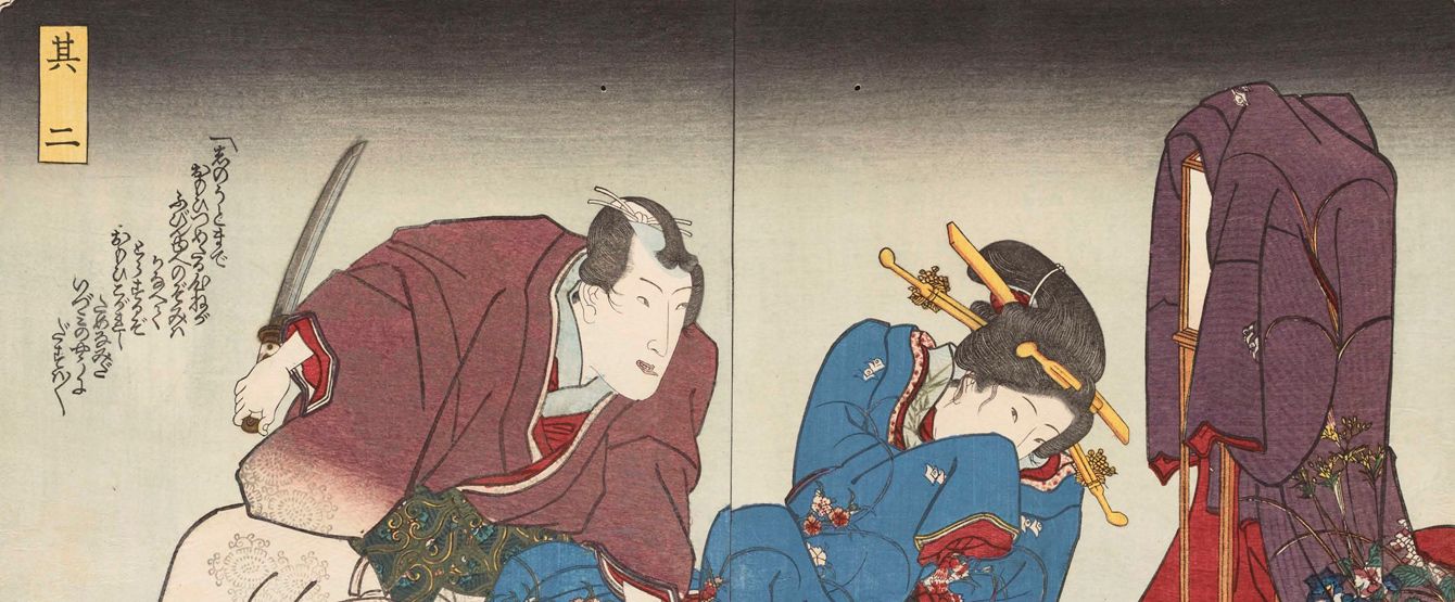 一陽斎豊国『霜釖曽根崎心中 天満屋おはつ・平野屋徳兵衛』、