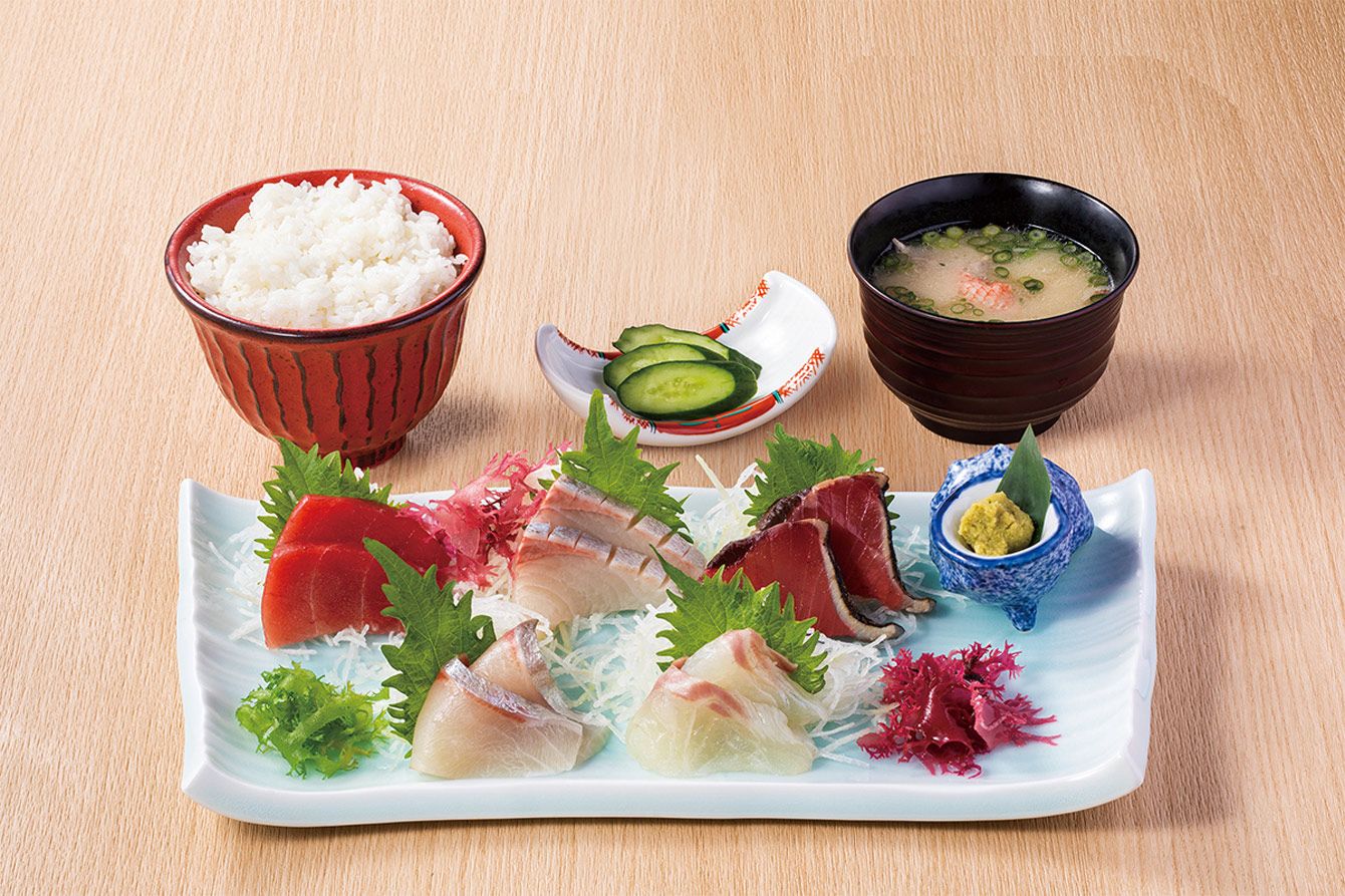 ランチメニュー「魚河岸お刺身5点盛り定食」(税込み1480円)。魚種は仕入れ状況によって異なる場合があるという
