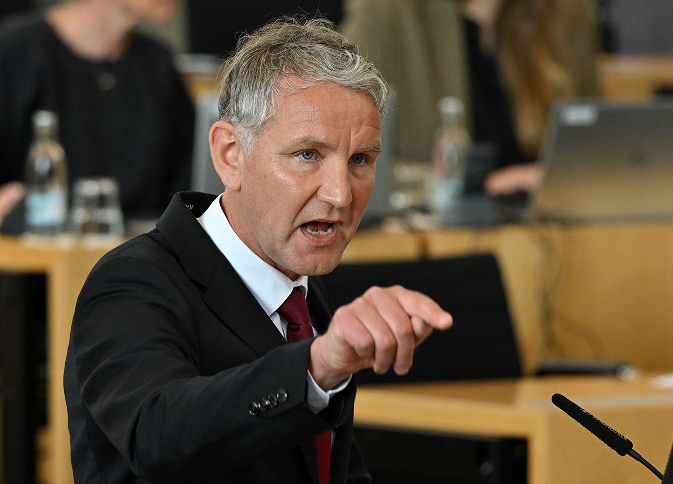 ドイツ・チューリンゲン州で第1党となった右派政党「ドイツのための選択肢」で演説するビョルン・ヘッケ党支部長=2025年5月15日、チューリンゲン州エアフルト