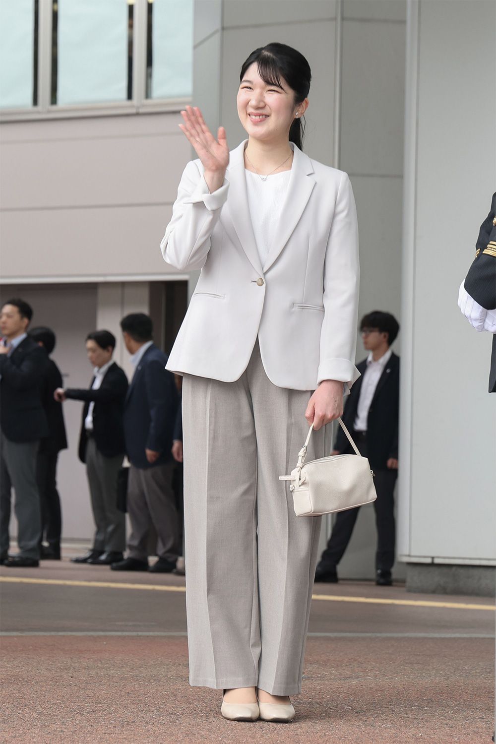 JR金沢駅で集まった人たちに手を振られる天皇、皇后両陛下の長女愛子さま=2025年5月18日午後、金沢市(代表撮影)