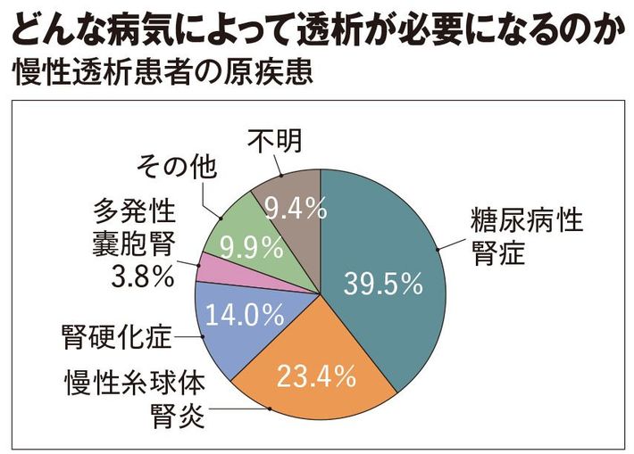 「糖尿病性腎症」は糖尿病の合併症による腎疾患。「慢性糸球体腎炎」は腎臓の糸球体が炎症を起こして、血液をうまくろ過できなくなる疾患の総称。「腎硬化症」は高血圧が原因で腎臓の血管に動脈硬化を起こし、腎臓の障害をもたらす疾患。