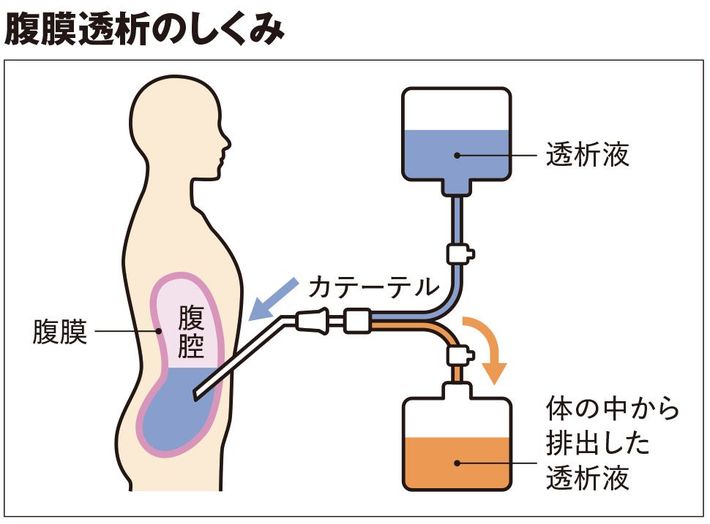 腹腔内に透析液を一定時間入れておくと、腹膜の細い血管を介して血液中の老廃物や余分な水分が透析液へ移動する。十分に移動した時点で透析液を体外に排出することで、血液をきれいにする。