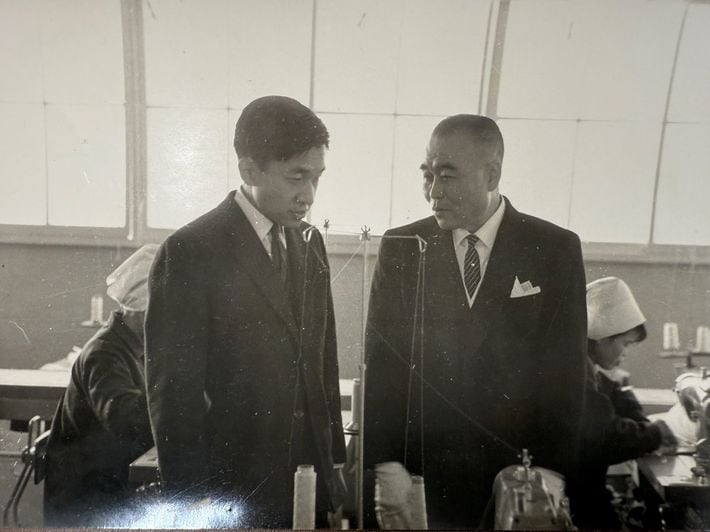 1964年、秩父の工場をご訪問された皇太子殿下(左)と嶋﨑義孝社長