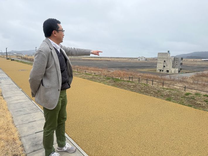 被災地を案内する嶋﨑博之社長。9割の事業所が流されるなどして事業を継続できなくなった