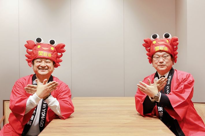 吉本興業所属の大谷ノブ彦さん(左)と鳥取大学医学部附属病院の武中篤病院長(右)