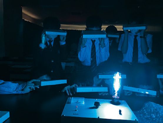 工作用紙などで自作した分光器で光スペクトルを観察
