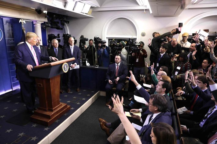 ホワイトハウスでトランプ大統領(1期目)に質問する筆者。記者席最前列の一番奥で、手を上げて立ち上がっている。2020年2月26日