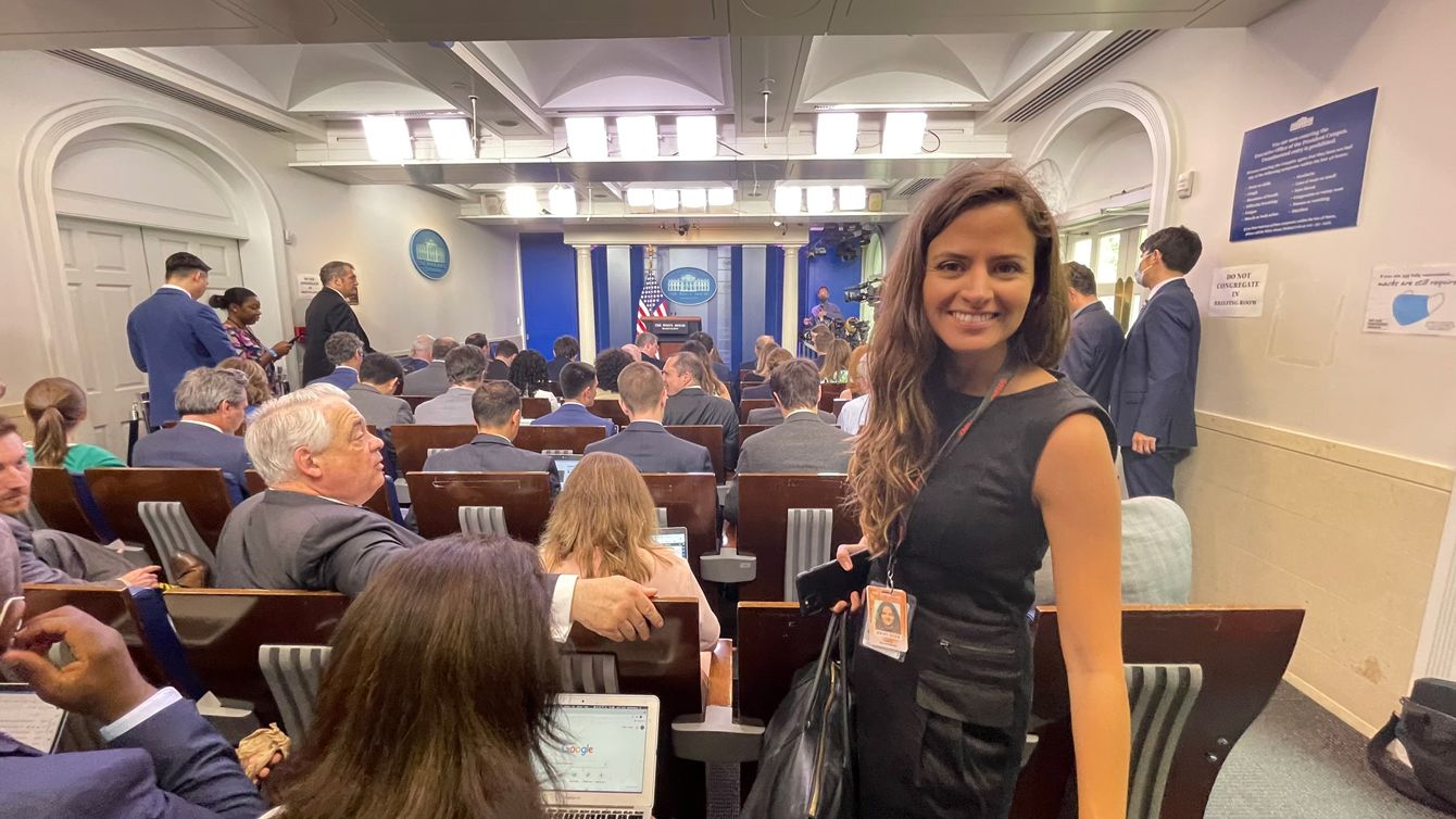 ラクエル・クラヘンビュール(Raquel Krähenbühl)さん。ホワイトハウスの記者会見室で
