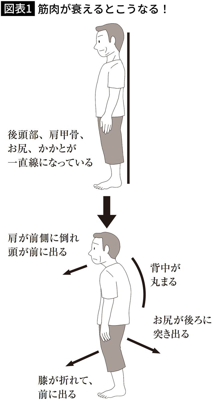 肉体的な老化が進み、筋肉が弱っていった人の姿勢(出所=『