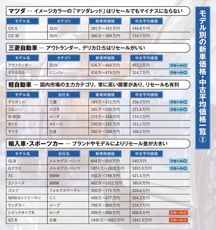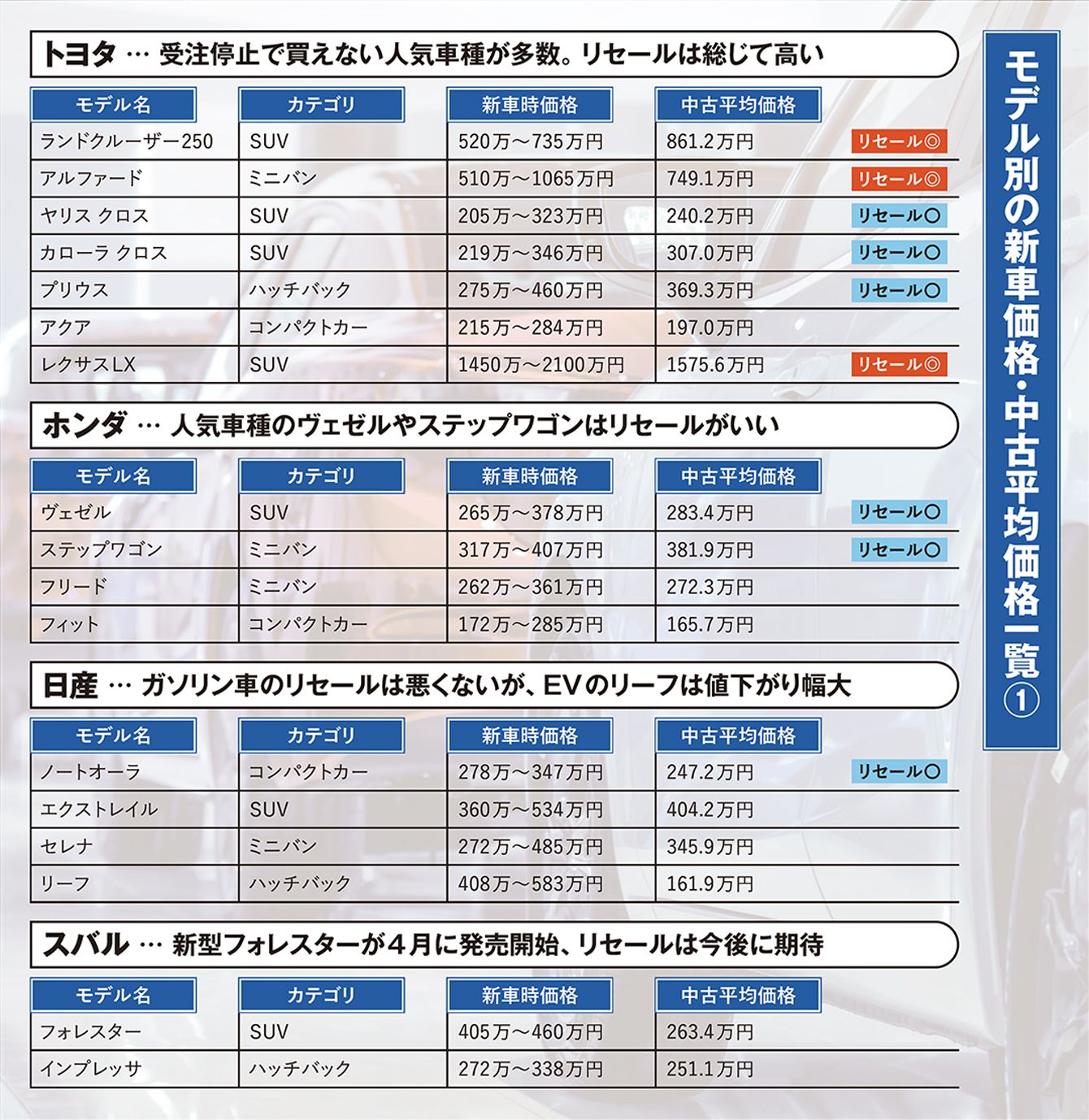 ※新車時価格は各車の公式HPの参考価格を参照、実際の購入時には別途諸費用あり ※中古平均価格は2025年4月18日時点でのカーセンサーの価格相場情報を参照