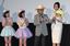 映画「それいけ!アンパンマン よみがえれ バナナ島」初日舞台あいさつの漫画家のやなせたかし(右から2人目)。右端は女優の木村佳乃(=2012年7月7日、東京都豊島区)