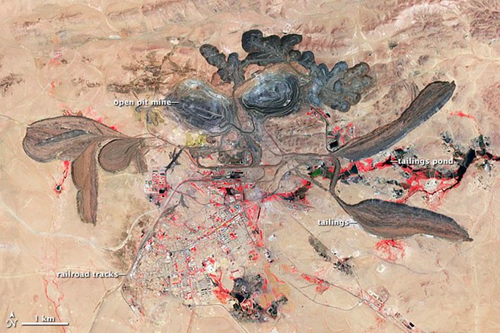 中国・内モンゴル自治区バヤンオボーのレアアース鉱山の擬似カラー画像(写真=NASA Earth Observatory/PD NASA/