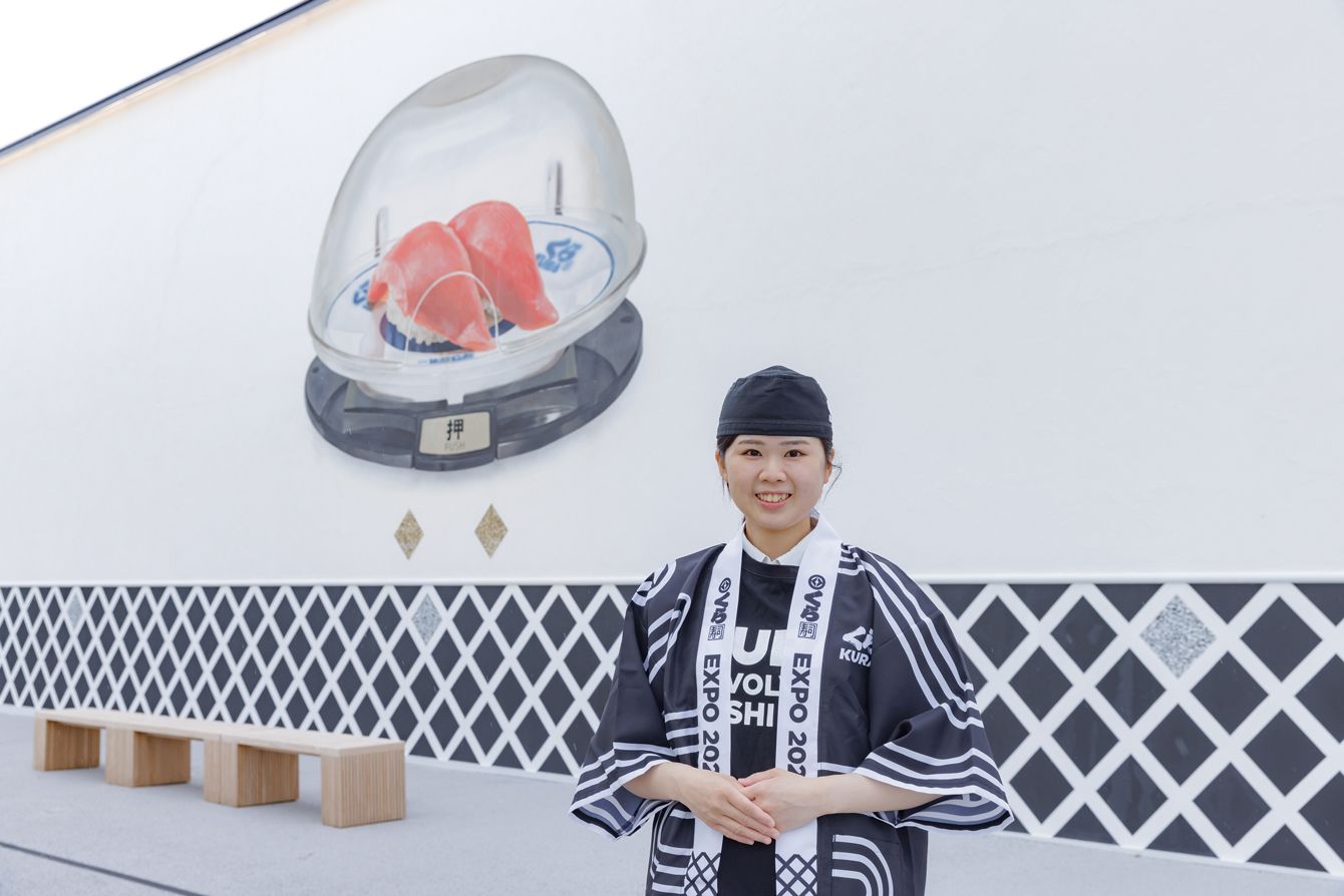 くら寿司大阪・関西万博店の外壁は廃棄予定の貝殻をリサイクルしたもの。スタッフのユニフォームも万博仕様。3種類のハッピがある